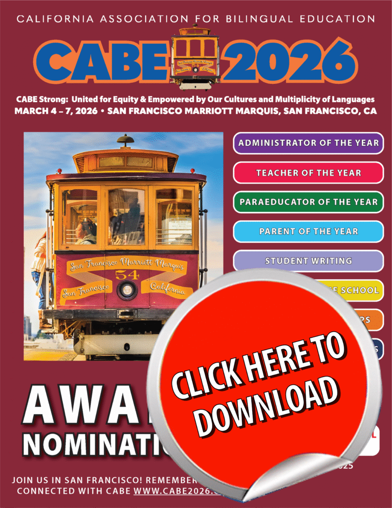 CABE invites you to submit candidate applications for Administrator of the Year, Teacher of the Year, Paraeducator of the Year, and Parent of the Year, as well as applications for the Seal of Excellence School Award, Teachership Awards, and High School Student Scholarships for Future Dual Language Education Teachers. This is an opportunity to honor individuals and schools in each category for their excellence, dedication, multicultural competency, educational equity for all multilingual and English learner students, and the promotion of dual language education.