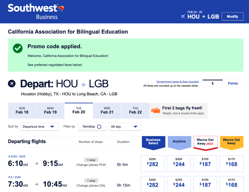 Southwest® is pleased to offer discounted fares for CABE 2024 attendees. Book your flights on SWABIZ.com using Company ID 99322823 to qualify for eligible discounted rates. Make sure your Rapid Rewards® number is included in your booking to earn points on qualifying flights.